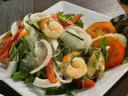 The menu features river prawns, lobster, squid, sea bass, mussels, salads, pasta, pizza, cheeses and cold cuts, soups, Thai dishes, desserts, tea, coffee, and more.
