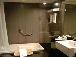 One Bedroom Suites, the first thing you see when you open the door is the entrance hall, which has a wardrobe, luggage rack and refrigerator. The door on the left is the bathroom. The living room of this house is more like a studio, with a work desk and a TV. The sofa is placed in the bedroom. There is another TV in the bedroom. The bed is a king bed with moderate softness and firmness, which is very comfortable to sleep on. The bathroom outside the bedroom has a bathtub with strong water pressure.