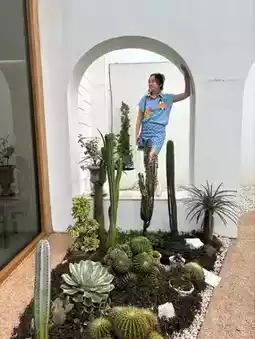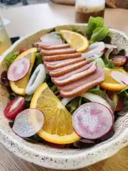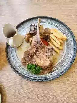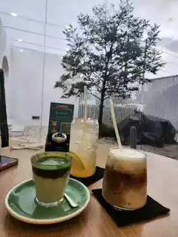 The cafe is located on the main road near Lat Krabang. The atmosphere is very beautiful. It is in the city center but it feels like going to the beach. There are both savory and sweet dishes. There is also a sign guaranteeing deliciousness from Krua Khun Reed. I ordered Porkchop steak and smoked duck salad. The taste was good and delicious. I also ordered 3 more drinks: Lemon Soda, Cappuccino and Dirty Green Tea. The total price was around 1,000+ but I was full and delicious. I ordered dessert and couldn't eat anymore.