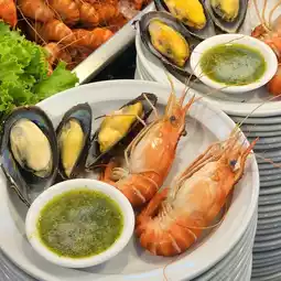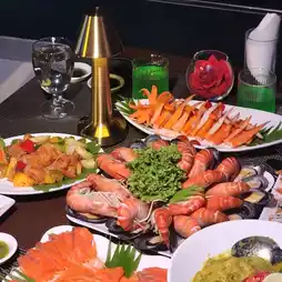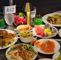 👍 The must-try and all-you-can-eat menu includes the Salmon Sashimi Station, freshly sliced with sushi 🍣, river shrimp and mussels, the Thai food corner with a strong, rich taste, complete with curry, rice, and snacks, the Western food corner, the salad corner, the fruit and dessert corner, and various drinks, both ALC and fruit juice (additional orders are available at an additional cost).