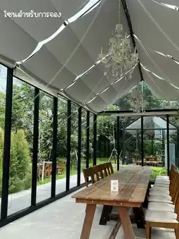 • VIP pavilion zone ⛲️ - This will be on the side. It's a zone for those who come in groups, want privacy, or have a small party. It's a tent + glass room (which is very beautiful). Inside, there will be a long wooden table, air conditioning, and a chandelier. It's very luxurious and beautiful. We walked to take pictures there many times because we like it. In addition, this zone also has a small vegetable garden in the middle of 2 tents. It feels very good, lol.