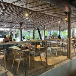 A Mediterranean restaurant with a nice atmosphere. There is an outdoor area with a thatched roof seating area surrounded by a beautiful, shady garden, like we are eating at a resort. If anyone likes an air-conditioned room, there is also an indoor area, a cute house in white and blue tones, which is a unique color scheme of Mediterranean houses.