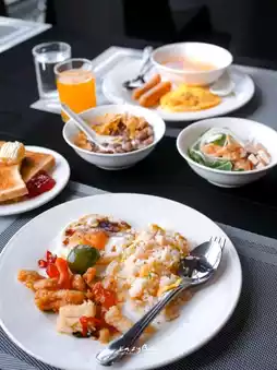 Complete amenities. I really like their shampoo and shower gel. They are good to use, fragrant, and clean. ๐๐ผ Netflix, YouTube, Bluetooth speakers, Wireless Charger, swimming pool, gym, cafe, rooftop bar, they have it tooโจ And breakfast There is also a halal type for Muslims to eat.