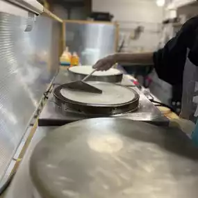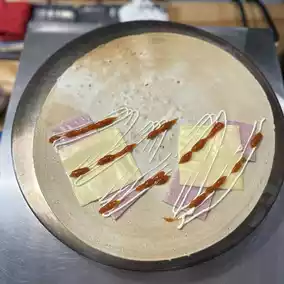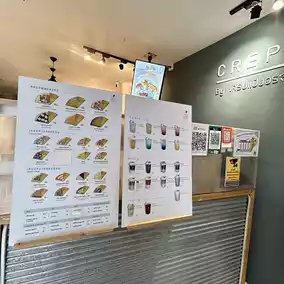 Want to eat crepes? Come this way. A delicious crepe cafe that uses real butter ðŊ Thin and crispy dough with a variety of fillings to choose from. There are menus to choose from: savory and sweet crepes. But if you don't like it, you can choose the toppings as you like. Prices start at 45 baht. In addition to being famous for crepes, there is also a drink called butter ðŧ beer that has foam like real beer, but no matter how much you drink, you won't get drunk ðð There aren't many tables to sit at in the shop. Most people buy it to take home. We ordered a crepe with ham, cheese, and mayonnaise. It was very delicious and crispy, and the cheese was good.