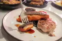 Hungry, order fried rice with beef fat and salmon steak, focus on being full, happy, good taste.