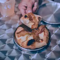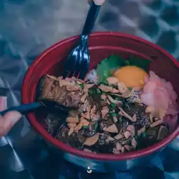 After having fun taking pictures at Asiatique, go to recharge at Bacon Salmon, a cool stainless steel capsule food truck located in front of Soi Charoen Krung 72/2. The menu, whether it's pizza or Japanese rice, is very delicious.