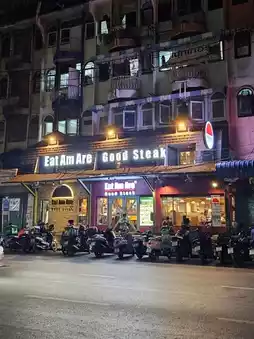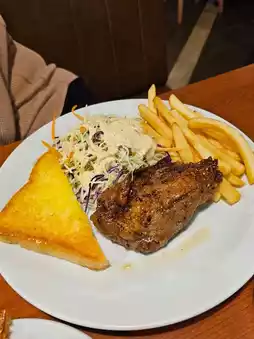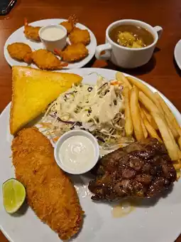Hello, today I will review a steak restaurant at Suthisan Intersection. The restaurant is located in Bangkok. When you drive past this restaurant, you will see a prominent sign. So, I took the opportunity to try it. This place has everything. They have spaghetti with rice, pork, chicken, beef, and fish steaks, and there are also additional options such as salad, fried shrimp, French fries, mashed potatoes, and various soups. For those who like spaghetti, I recommend this as another good restaurant.