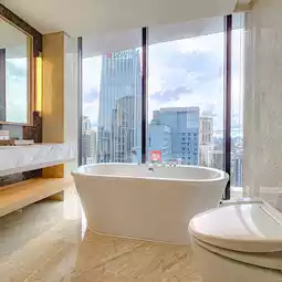 This time, we stayed in the Skyview Executive Suite, a room with a stunning city view, decorated in a simple and luxurious style, modern style, spacious room, large soft bed that sucks your soul, with large clear glass windows with a full view of the city, a bathtub for soaking in a relaxing soak, a beautiful view, a sofa corner, a work desk corner, a kitchen, an iron, a washing machine, everything is complete, the room is divided into perfect proportions, with complete amenities, perfect for a perfect relaxation.