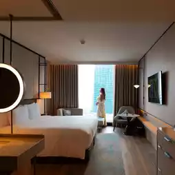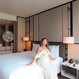 The hotel is decorated in a modern contemporary style, combining the uniqueness of Thailand with modernity in a beautiful and harmonious way. The color tones are soothing to the eyes. Today, Fern stayed in a Deluxe Room, a room with a city view, a soft king-sized bed, and a sofa to sit and enjoy the view. There is a work desk, complete amenities, and a common area for use, such as a swimming pool, fitness center, restaurant, cafe, and rooftop bar.