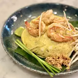 R02 Shrimp Pad Thai covered with egg (200 baht)
