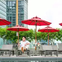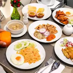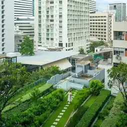 . Let me tell you that the breakfast here is delicious, it's convenient to travel, and there's a shuttle service from BTS Nana. The rooms are standard, beautiful view, and the room size is just right. The location is good, near restaurants, shopping malls, hospitals, and embassies. On the 7th floor, there's a fitness center and a green sky garden for you to walk and relax and breathe in the air. Or go up to the Rooftop. There's a swimming pool with a beautiful view both day and night.