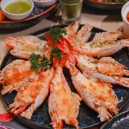 Grilled shrimp with juicy shrimp roe, Wagyu noodles, truffle steak
