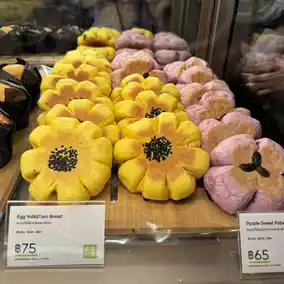 Try their signature Purple Sweet Potato & Toro with egg yolk Btead. It's generally delicious. Big pieces, full of filling, not too sweet, soft and chewy dough (75 baht). There are also breads with various fillings, both savory and sweet, bagels, crepes, tarts and toast.