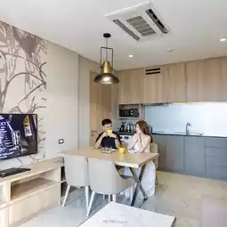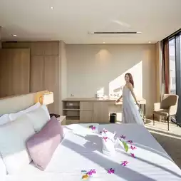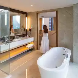 - This trip is called a relaxing trip to heal your heart. Stop by to stay at a 5-star hotel. The room we stayed in was the Skyview Executive Suite. The room had a wide, soft bed with large glass windows, offering a full view of the city. The interior is decorated in a modern style and there is also a bathtub for you to soak in and chill. You can enjoy the night scape to the fullest. Staycation lovers, don't worry. They have clearly divided the work room, living room, and kitchen into separate areas from the bedroom.