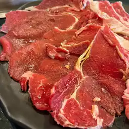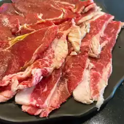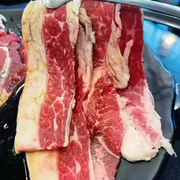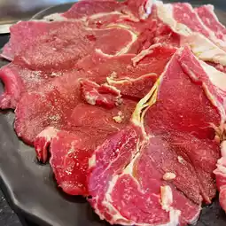 🥩 Thai Wagyu Rosu beef, I like it equally, I order it repeatedly as much as Karubi because it has less marbling, it's so lean. It's sliced the thinnest among all the meats, but it's not so thin that it shrinks when grilled. You still get a taste of meat that's not greasy, but still soft. It's easy to eat and very enjoyable.