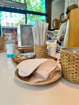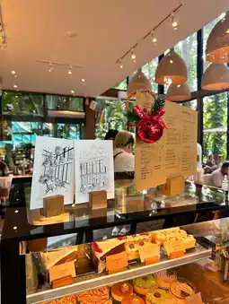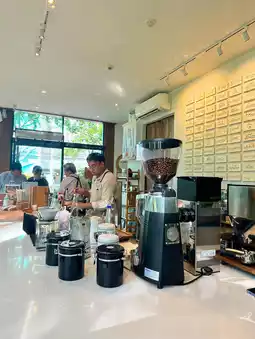 The atmosphere inside the shop, the coffee bar counter is clean white. Whether you sit outside or inside the shop, you can absorb the green natural atmosphere.