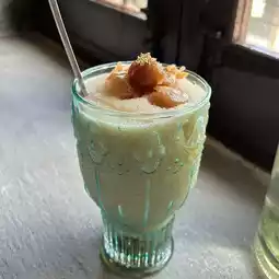 The soymilk menu here is outstanding. They have both light and dark roast soymilk. But today, since it's very hot, we ordered a longan slurpee. It was amazing because the longan juice was very thick. In the glass, there was longan on top and longan on the bottom. It was very juicy. Wow, it's very refreshing. It's really longan. I really like it. You have to come and try it. You can walk from Pak Khlong Talat.