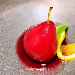 - Poashed pear in orange sauce, so soft that it can be cut into pieces, with a slight orange fragrance.