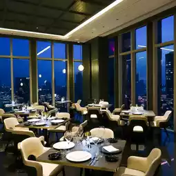 😊The interior of the restaurant is decorated with the chicness of Bangrak on the walls. It is an entertainment and shopping center. The color tones are blue and black, making it look intriguing. With a high-angle view from the 30th floor