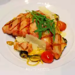 -Spaghetti Aglio e Olio Spaghetti Olio With smoked grilled salmon, large pieces, just the right amount of spicy, this dish is full.