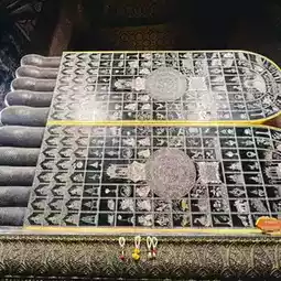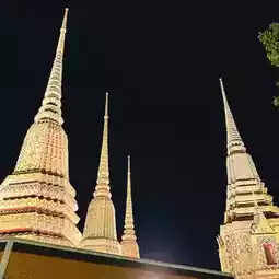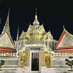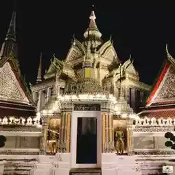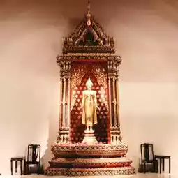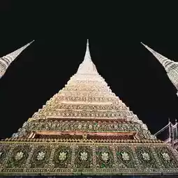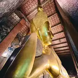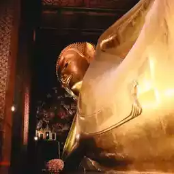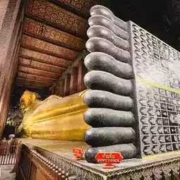Wat Pho (Temple of the Reclining Buddha), also known as the Reclining Buddha of Wat Pho, is a Buddha image in the posture of provoking Asura Indrahu. It is the third-longest reclining Buddha in Thailand. The Buddha's body is constructed of brick and mortar, and is entirely lacquered and gilded. Each foot of the Reclining Buddha measures 1.5 meters wide and 5 meters long, and features 108 auspicious symbols inlaid with mother-of-pearl patterns. Each auspicious symbol is enclosed in a small square, surrounded by a wheel symbol in the center of the foot. Each foot has the same symbol on each side.