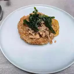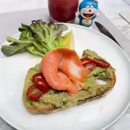 Cake chooses to sit in the outdoor area, a table by the koi pond, shady, buffet line service and A la carte Smoke Salmon Tartine / Spicy 🌶️ Thai Omelette “KAPRAO