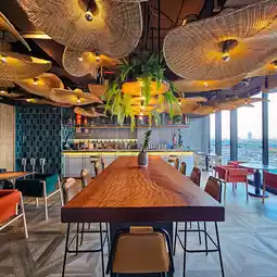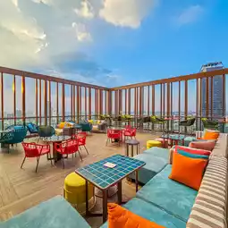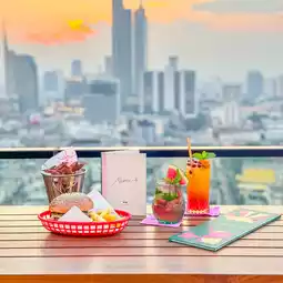 🍸In the evening, come chill at 𝐌𝐢𝐦𝐢’𝐬 𝐑𝐨𝐨𝐟𝐭𝐨𝐩, a 25th-floor bar with a cute Miami-style color bar. Watch the sunset, eat delicious food, sip cold drinks, and enjoy the beautiful night view of the city.