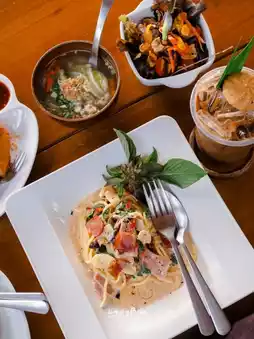#Travelwithtrip2024 A warm riverside restaurant and cafe, Khamrak 🍃 Delicious food, friendly prices, no MSG, made by your mother or grandmother in a great atmosphere, like sitting in a backyard by the river, comfortable ✨🌳 Or if you want to sit in an air-conditioned room, they have that too.