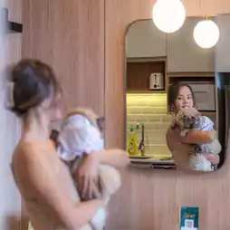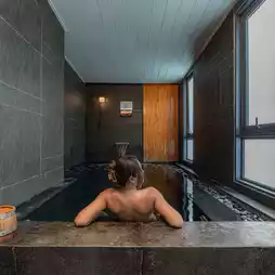 The common area here is also available for both us and our 4-legged children. We have many areas, such as a swimming pool with a city view, a fitness center, a sauna, and an onsen. Our children's area is a small outdoor garden with space for them to walk around.