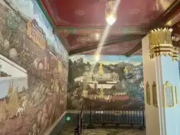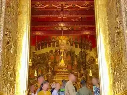 Inside the ubosot (ordination hall) is the Emerald Buddha, a meditative Buddha image made entirely of a single green gemstone. The lap width is 48.3 cm, and the height from base to top of the head is 66 cm. It is enshrined in a golden pavilion.