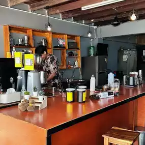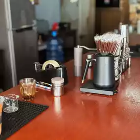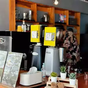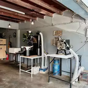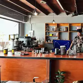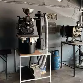 🏡 The shop is a 2-storey open building located in an alley opposite the Bangchak gas station, which was converted from my father's garage into a coffee shop. It even has its own coffee roasting machine. It's so cool!