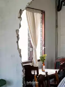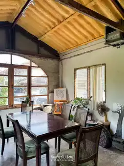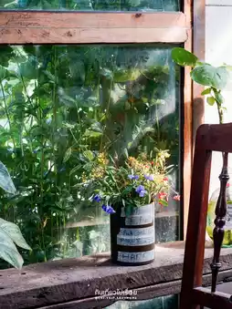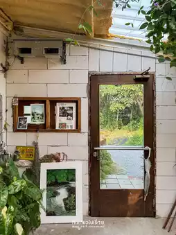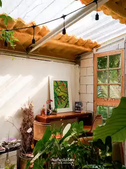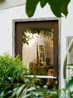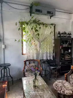 #Songkran2024 travel destination Jungfood Cafe is a very cute shop, like a house in a fairy tale. The shop has 2 floors. The ground floor has a counter for ordering food. There are a few seats. Each table has a different decoration style. Some tables are decorated with green plants. Some tables have small potted plants, picture frames, and home decorations. I can tell you that every corner is cute. But the main thing is that there are plants all over the shop. It looks different.
