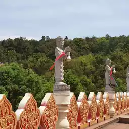 Longwei Temple is a breathtaking Buddhist sanctuary. Upon entering the temple grounds, one is greeted by a vast garden, where towering pagodas and temples are staggered in an orderly fashion, surrounded by lush tropical vegetation, creating a tranquil and peaceful atmosphere.