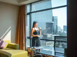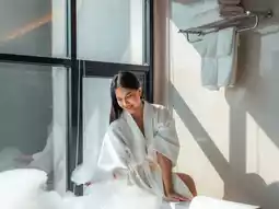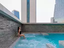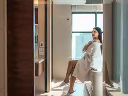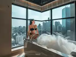 🛁 The hotel atmosphere is beautifully decorated, starting from the lobby. The rooms here are spacious, clean, with soft and comfortable beds. All rooms are fully equipped with amenities. The view from the room is also very beautiful. This room we have is a Premiere Suite, a large room of 70 square meters. The highlight is the jacuzzi. The bathtub is very large and comes with complete functions. Wow, I like that there is a lighting system that changes colors. The corner of the bathtub can see the atmosphere when the sun is setting.