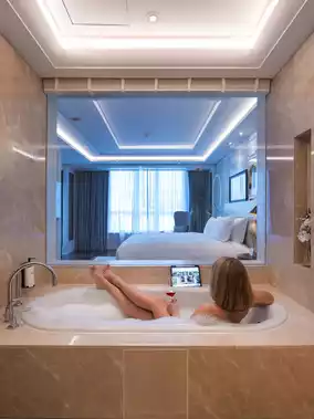 and a bathtub area. Soak in bubble water, lie down and watch series. And