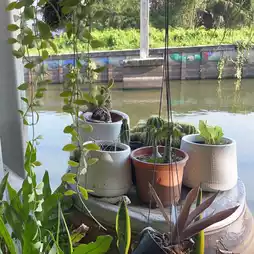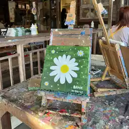 After crossing the market bridge, turn left and continue straight. You will see a cool painting shop. The total cost is 199 baht. You can choose the size of the cloth. The price is the same for all. Then choose the color, brush and put on an apron. Then, you can paint in your own style. I recommend sitting at a table by the canal. It's very cool.