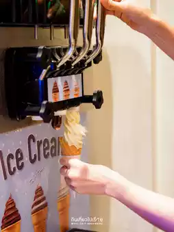 For snacks, there are grilled meatballs, papaya salad, quail eggs, steamed dumplings, cream-filled buns, steamed bread with custard. Finally, Thai-style desserts include shaved ice, lod chong, and sri lam. And finally, soft-serve ice cream that you can press yourself. You can choose whether you like a cone or a cup. It's so good. 🍦🍨