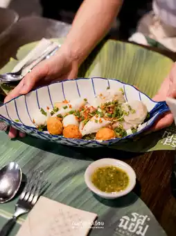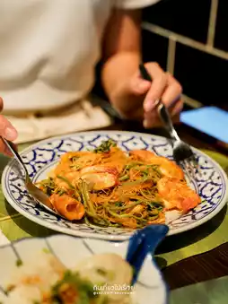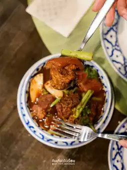 The menu here focuses on single-dish meals. There are all kinds, from fried rice/various toppings, noodles, kuay jap, pork leg rice, to a set of khanom jeen with curry. But there are also rice dishes. You can order and share. There are also desserts like mango sticky rice. 🥭 The average price is 150-200 baht per person.