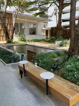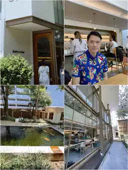 🌟 BABYCCINO, located in the Ekkamai district of Bangkok, is famous for its high popularity and reputation as an internet celebrity store. When we arrived at noon, there were already many people waiting, most of the customers were foreigners. Even after waiting for about half an hour, customers still came in an endless stream. I like the exterior of this place, a white villa-style cottage with two floors. The second floor is not a restaurant but a spa. There is a huge fish pond at the entrance of the restaurant, which is filled with many koi carps, and there are benches next to it for guests to rest.