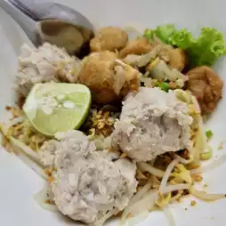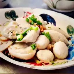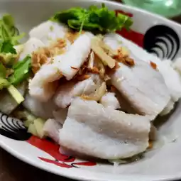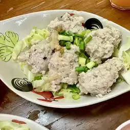 Hakka dry noodles are a bit spicy, with various wontons, fish balls, and fish dumplings on top, and bean sprouts as a side dish. The bottom is seasoned with peanuts, garlic crisps, soy sauce, fish sauce, etc., and there is a piece of lime on top. It tastes very fragrant with sauce, which is very suitable for egg noodles. In addition to the basic Thai four treasures, the seasonings on the table also include fish sauce and peanut crumbs. I would recommend adding more peanut crumbs, and those who like spicy food can add more chili powder. It is a bowl of noodles with a suitable heavy taste. The fish meat is very refreshing, it should be basa fish, and the portion for 90 baht is quite large. There is also blanched cabbage at the bottom. A special dipping sauce is included. The sweet and sour taste is very similar to the common seafood sauce in Thailand. The color is yellowish.