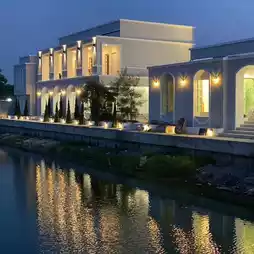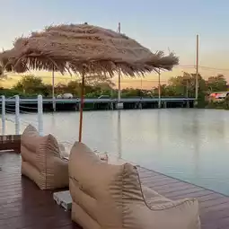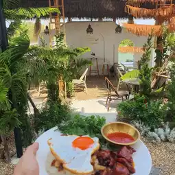 The shop is decorated in a Balinese style but with a luxurious European feel mixed together. It's very beautiful! The shop is actually very large. There are both indoor and outdoor areas. There are both savory food menus, cakes, and coffee and non-coffee drinks.🍰 But the air-conditioned area is a bit small. I recommend sitting outside to see the riverside view. The atmosphere is very good.⛅️ It's really chill like being by the sea🌴 I recommend coming in the afternoon or evening, you know. The light is so warm~ It's even better to sit and eat snacks and sip tea by the water💓