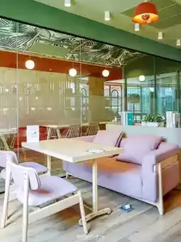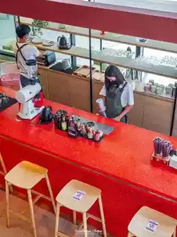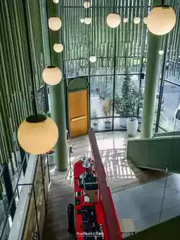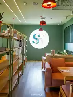 📚 The interior is made with a 2-story high ceiling, emphasizing green and orange contrasting well. On the 2nd floor, there are both bar seats, tables and a meeting room. In addition to being a meeting room, it can also be booked as a party room, a dinner date with friends or a birthday party.