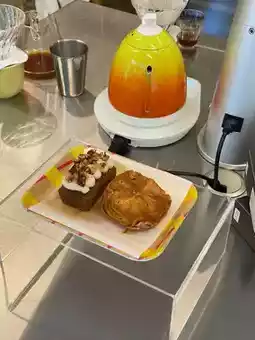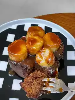 Legendary shop with a new storefront, super cute Scandinavian style, Copenhagen feel 🤣 Located in the SCOPE Promsri project. 🍞🍌 Don't miss the most popular menu, Mom's Banana Cake. The cake is super moist, love it so much. There is a slight burnt smell from the caramel sauce. It's so good. We can eat the whole piece by ourselves. It looks like caramel sauce, but it's not very sweet, everyone. It smells very banana. There are sliced bananas. 💕