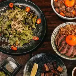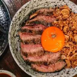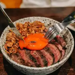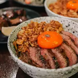 - Beef rice bowl, grilled wagyu beef rice served with fried shallots and pickled eggs