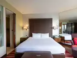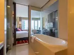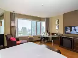 The rooms here come in various types. Today, the two of us are staying in a Deluxe Executive room, which offers city views and is fully equipped with amenities. The bathroom has a bathtub to soak in. Additionally, there is a spa, fitness center, swimming pool, club lounge, and the Atelier restaurant where you can recharge with an international buffet, as well as the Tapas Vino restaurant for those who love Spanish food.