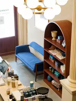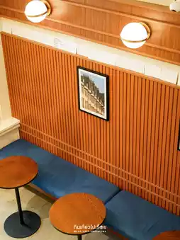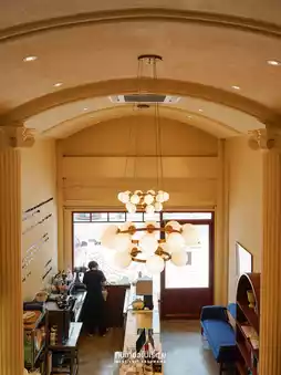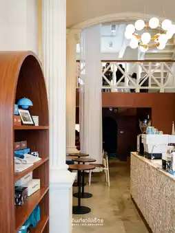 🏛️ The shop is a single-room shophouse that has been renovated into a space for people to come and relax, sip coffee, and eat light snacks, in the style of Bath, England. When you push the door open, the most striking decoration is the large columns that look like they were in the Roman era on both sides. The roof is made to look like an arched archway, making it look grand. The first floor and mezzanine are made into a double volume, making this shophouse look even more interesting.
