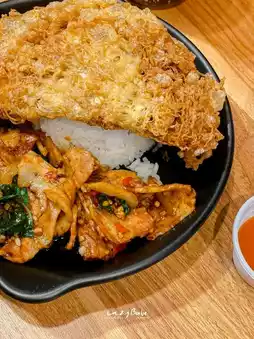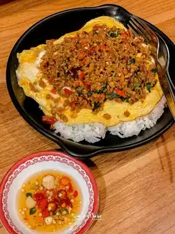 Stopped by to eat at a shopping mall again. Each menu is served on a cool pan 🍳 I'm always shocked when I accidentally touch it because I think it's a hot pan 🤣 But it's a plate that looks like a pan, it's not hot, lol. The taste is good, familiar, just like the กะเพรา I ate when I was a kid.