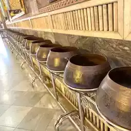 It is said that you can throw away your worldly desires by putting 108 coins into each of the 108 bowls lined up in a row. You can do this by purchasing 108 old coins that are no longer in use for 20 baht (about 80 yen).