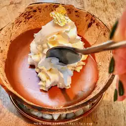 🍫 Soft Chocolate Coconut Foam: The chocolate mousse is very soft and smooth, fragrant with coconut, decorated with gold leaf, served in a beautiful coconut shell.