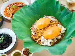Super crab and lotus leaf rice 🦀 Served in a large plate, suitable for 3-4 people. Served with Seafood dipping sauce, coarse and blended, with chili fish sauce: 2500฿